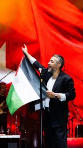 Konserinin bir bölümünde Filistin Bayrağı açan sanatçı “Savaşa Hayır” diyerek